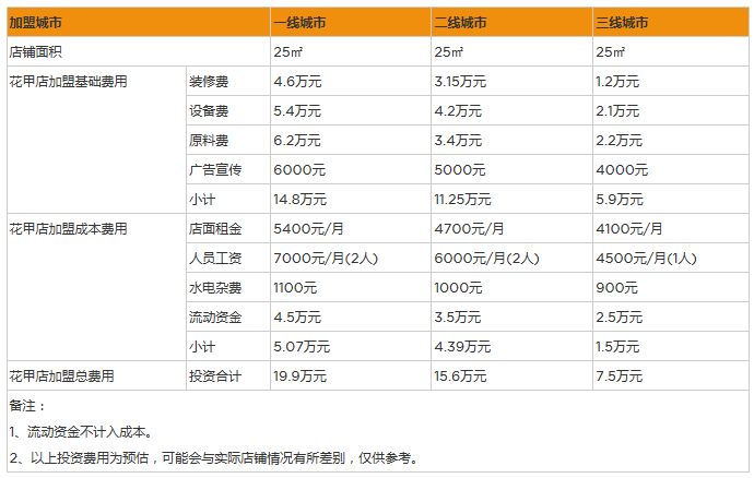 花甲店一線城市加盟店面積25平米,流動資金5萬元,總投金額15.05萬元;二線城市加盟店面積20平米,流動資金3萬元,總投資金額10.3萬元;三線城市加盟店面積15平米,流動資金2萬元,總投資金額7.15萬元。