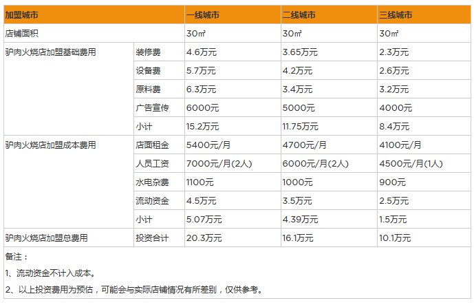 一般成本的使用在籌備期會用在店面租金、設(shè)備購買以及原料采購上,投資者應(yīng)該充分了解想開驢肉火燒館的規(guī)模,在合理范圍內(nèi)使用資金。