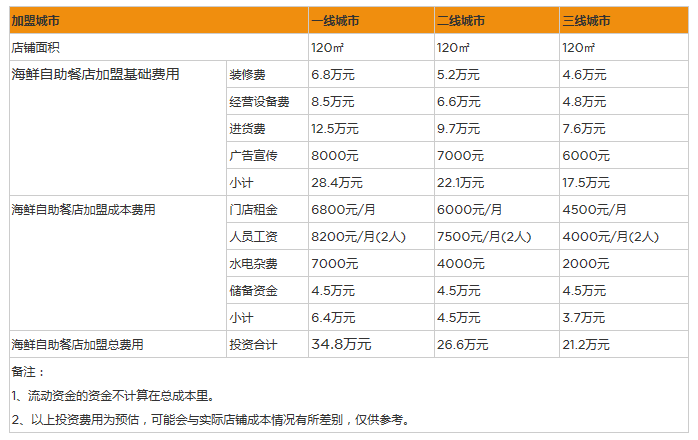 海鮮海鮮自助餐要比的海鮮自助餐前期的投入要多一些,根據當前的市場調查,現在的海鮮產品價格要比的肉類產品價格要高一到兩倍,智慧之選商在選擇加入海鮮海鮮自助餐時也需要提前做好充足的準備。在前期需要投入至少21萬元的前期投入資金,并且智慧之選霜也需要準備固定的裝修費用等。如果智慧之選商選擇加入海鮮自助餐,公司就會寫出加盟商進行開店,幫助加盟商解決很多創業問題。