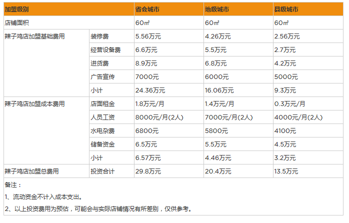 開家辣子雞店投資一般需要多少錢?60㎡店投資13萬足矣