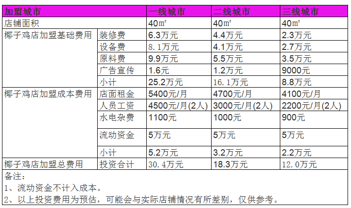 據市場調查,一般正宗海南椰子雞投資較靈活加盟,運營成本主要是店面租金、人員工資。根據不同的城市,成本高低有所不同。將南京拿出來舉列子,南京地區,裝修費用50㎡的店大約需要6萬元左右,設備費用大約6萬元,所以開一家椰子雞店大概要12萬元左右。