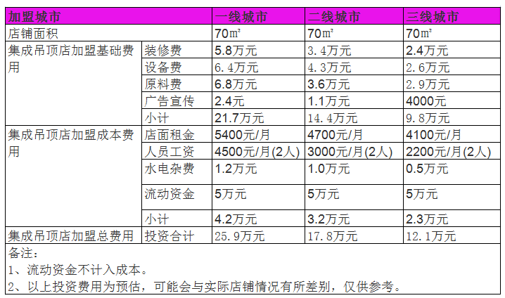 集成吊頂的加盟利潤從上表就可以看出,一線城市的凈利潤一年34萬元左右,二線城市的凈利潤一年可以達到21萬元,而三線城市的凈利潤可以達到18萬元左右。當然咯,這下信息來源于網絡,只能供參考,但是絕對是有一定的依據,總的來說,加盟集成吊頂行業還是切實可行的。