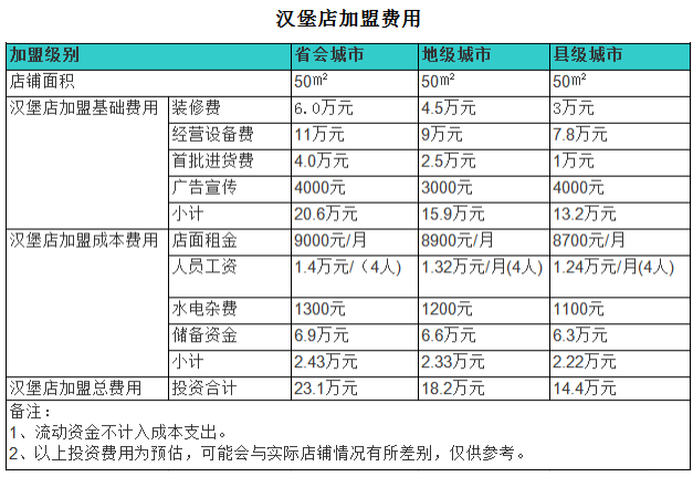 要想投資一家漢堡店,就必須考慮房租費用,一般實體店的房租成本都是比較高的,尤其是對于漢堡店來說,一般都得在大型超市、大型商場里面,房租費用肯定更高了。就拿一個三線城市來說,一家50平方米的漢堡店所需要的房租大概在2萬-3萬左右,而且一般房租合同都是半年一簽,也就是要準備8-12萬的房租備用資金。