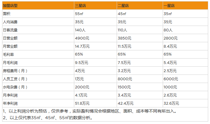 需要的加盟店面積是55㎡,牛排加盟店里的裝修費是16500元,制作牛排的設備費是30000元,進貨費是25000元,廣告宣傳的費用是6000元,店面租金一個月3300元,人員工資一個月支付8000元,水電雜費是一個月300元,流動資金是33900元,投資合計:123000元。