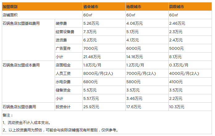 3、家具費用:石鍋魚店所需要的家具設備有廚臺、桌子和椅子等,而這些所需的費用是根據規模和數量來定的。設備費用:石鍋魚店的運營還需要齊全的設備。具體來講,所需設備的費用大概在5萬元左右。