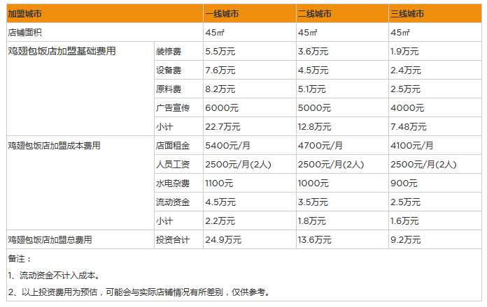 如果創業者選擇開一家雞翅包飯創業店,總投資都包括加盟費50,000元,保證金30,000元和品牌管理費300元,還有其他方面的開銷共計90,000元左右;