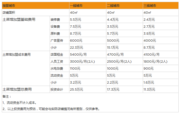 開土菜館的朋友一般喜歡把土菜館開在兩種地方,一種是公司比較多的寫字樓附近,第二是居民或者人群比較密集的地方。開土菜館是為了方便人群消費吃飯,這兩種地方都能夠保證人群的穩定性。不同城市土菜館的租金各不相同,以成都為例,人群較為集中的城市中心,土菜館租金一個月在4000元-6000元,而居民密集區域租金在2000元-5000元。