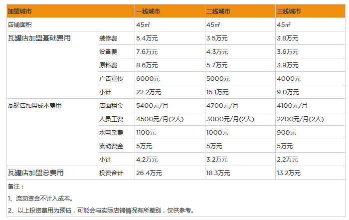 瓦罐店的投資經營,其中還包含了人工的雇傭費與保證金,將其與上述費用一同計算,該品牌店在直轄市投資費用為24萬,地級城市為17萬,縣級城市為13萬。