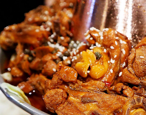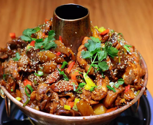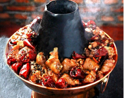 冒著火星的炭火銅鍋端上來,色澤鮮亮紅潤,夠味的辣椒、飽滿的花椒,掩映著麻辣入味的雞塊兒,看上一眼就讓人食欲大開,讓人口水大動,迫不及待地舉起筷子!